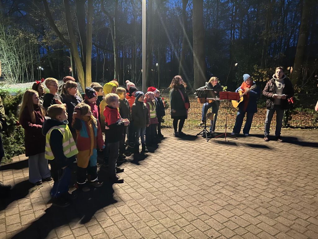 Zur feierlichen Einweihung des Weihnachtsbaums sorgten die Kinder der Grundschule. Mit viel Freude sangen sie Weihnachtslieder, die von Lehrerinnen stimmungsvoll auf der Gitarre begleitet wurden.